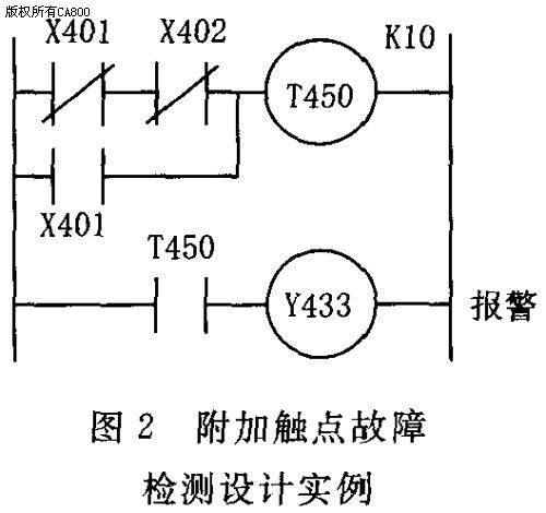 如在电气控制系统中有一中间继电器K,其一常开触点与X401输入端口相连,为了能够自动判断继电器K是否卡死或失效,现将其常开触点与X401相连,另一常闭触点与X402相连,如果卡死或发生失效,在继电器K线圈得电时,常闭触点断开了,但常开触点没有闭合;我们可采用图2的逻辑关系进行检测,即可发现故障。所以,在端口数量有多余的时候,多串入1个常闭触点,有利于准确发现故障。