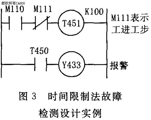 自动机床在工作循环中,各个动作都要求在一定的时间内完成,超过了规定的时间限制还没有完成动作,则可认为是机床设备运行出现故障,因此可以在被检测工步动作开始时,同时启动一个定时器,定时时间可以根据实际情况确定,但应比正常工作所需时间要长一些,如果定时器有输出信号则说明已出现故障,然后可以采取相应的处理措施。