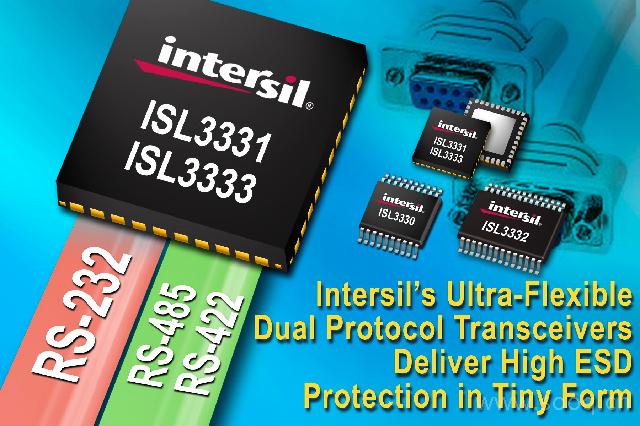 Intersil公司为市场提供了RS-232、RS-485/RS-422和多协议收发器。RS-232系列可在3.3V和5V电压下操作,具有发送器和接收器的许多种组合配置,遵循IEC61000 ESD保护标准。RS-485系列采用3.3V或5V电源,支持全双工/半双工模式,有许多速度等级可供选择,提供15kV HBM ESD保护。欲了解更多有关Intersil公司接口产品的信息,请登录。