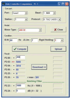 台达伺服在调试过程中提供了非常便利的软件(如上图),利用伺服驱动器内置的自动惯量估测功能测出负载惯量比JL/Jm填入软件中,再根据使用要求填入需要的响应频宽B.W.,选择匹配的马达型号后,软件可以计算出一套最匹配的增益参数,然后下载到驱动器。三个轴向中,主轴朝一个方向旋转对伺服电机要求不是很高,增益可以调整的低一些。D轴和H轴要高速频繁启停,增益要调整的高一些。