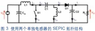 SEPIC 转换器提供了一种降压转换,直到输入电压等于或者降到输出电压电平之下。然后,其将提供升压转换,直到电池电压降至最小容许输入电压的电平。使用 SEPIC 的一个主要弊端是,它需要一个单耦合电感器(变压器)或者两个单独电感器,以及一个耦合电容器,如图 3 所示。