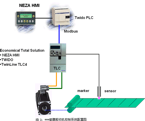 关于伺服定位及剪切,客户的基本要求包括两个部分,第一功能称为无色标模式,要求为每分钟剪切600MM-1000MM长的塑料编织袋35个,切刀在编织袋定位完成后进行剪切,具体到单次的时间,剪切动作需要0.5秒左右,伺服定位的时间约为1.2秒。第二功能称为色标模式,要求为当塑料编织袋上印有色标时,需要根据色标来进行剪切。通常是距离色标位置300MM处。 系统配置: 系统配置见图2所示: