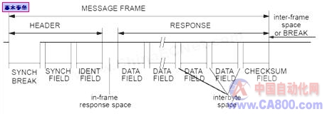 一个报文帧如图 1-2所示,是由一个主机节点发送的报文头和一个主机或从机节点发送的响应组成。报文帧的报文头包括一个同步间隔场(SYNCH BREAK FIELD)、一个同步场(SYNCH FIELD)和一个标识符场。报文帧的响应(RESPONSE)则由3 个到9 个字节场组成:2、4 或8 字节的数据场(DATA FIELD)和一个校验和场(CHECKSUM FIELD)。字节场由字节间空间分隔,报文帧的报文头和响应是由一个帧内响应空间分隔。最小的字节间空间和帧内响应空间是0,这些空间的最大长度由报文帧的最大长度TFRAME_MAX。
