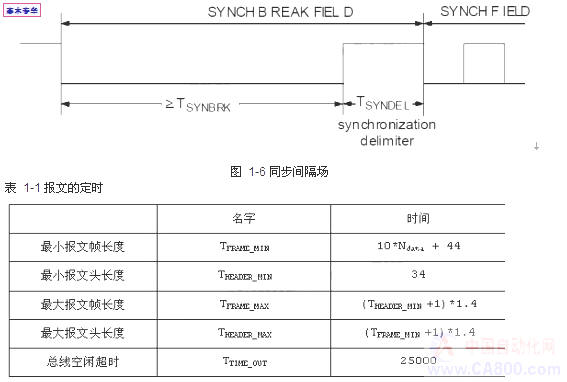 为了能清楚识别报文帧的开始,报文帧的第一个场是一个同步间隔。同步间隔场(SYNCH BREAK FIELD)是由主机任务发送,它使所有的从机任务与总线时钟信号同步。同步间隔场有两个不同的部分如图 1-6所示。第一个部分是由一个持续TSYNBRK或更长时间(即最小是TSYNBRK不需要很严格)的显性总线电平。接着的第二部分是最少持续TSYNDEL 时间的隐性电平,作为同步界定符。第二个场允许用来检测下一个同步场(SYNCH FIELD)的起始位。最大的间隔和界定符时间没有精确的定义,但必须符合整个报文头THEADER_MAX 的总体时间预算,THEADER_MAX在表 1-1中定义。