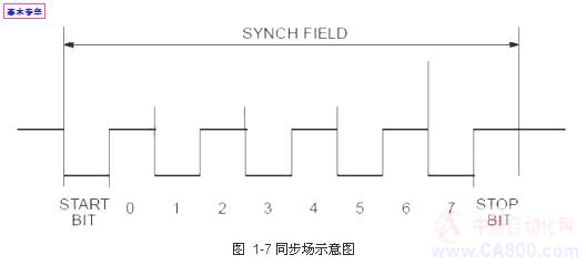 波特率测量是在LIN总线的同步场(SYNCH FIELD)进行的。同步场包含了时钟的同步信息。同步场的格式如图 1-7所示,它通过使UART发送"0x55"来实现,表现在8 个位定时中有5 个下降沿(即:"隐性"跳变到"显性"的边沿)。使用SPMC75F2313A的捕获输入功能可以很方便的测量出相邻两个下降沿之间的时间间隔,利用这个时间间隔就可以算出波特率。