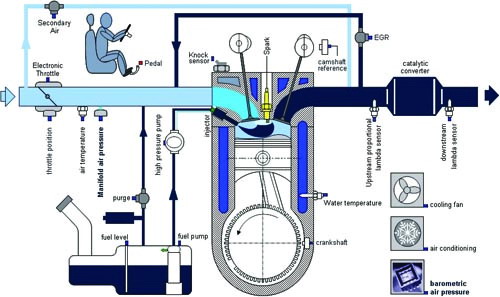 为了更好地控制燃烧过程,汽车制造商越来越多地使用可以对物理参数进行准确测量的传感器。这也是近年来德国能将汽车平均油耗从20世纪80年代的大约10升/100公里降到大约7升/100公里(从每加仑大约24英里提升到大约34英里)的原因之一。此外,从1992年开始,每四年欧洲都要推出新的排放控制标准,以便降低汽车污染物的排放。
