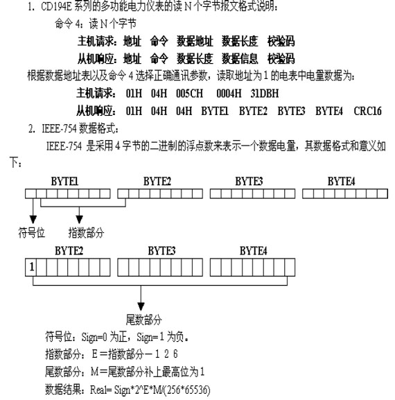 注:从CD194E 系列的多功能电力仪表传过来的电功率数据就存放在Byte1 到Byte4 内。