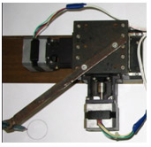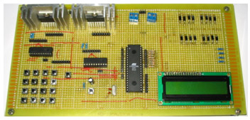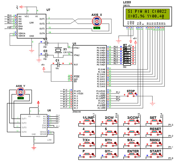 ![]() 图4 步进电机控制系统硬件电路仿真 如图4所示,单片机AT89C55司职步进电机控制器,通过运行在Keil uVision2 环境下所开发的程序来控制两个步进电机驱动芯片L298,从而实现对AXIS_X / AXIS_Y两轴步进电机的联动控制。L298驱动芯片的步进脉冲输入信号来自AT89C55 P0端口,使能信号ENABLE A与ENABLE B并联接到AT89C55的P3.0、P3.1口,由程序控制实现步进电机的使能,从而避免电机线圈处于短路状态而烧坏驱动芯片。4 x 4键盘阵列接AT89C55的P1端口,通过程序设计定义每个按键的具体功能。LCD的数据端口DB0~DB7接AT89C55的P2端口,控制端口RS, RW, E分别接单片机的P3.5, P3.6, P3.7口。相关的参数值、X/Y轴坐标值可以通过LCD以文本方式显示。本文采用软硬件协同仿真的方法经过设计à测试à修正à再测试一次次迭代开发,在制作控制系统硬件电路之前即可实现对系统整机功能的测试。待系统程序和硬件电路设计方案最终完善之后便可以实际制作如图5所示的硬件电路。显然该种方法可以显著提高系统软硬件开发的成功率,从而有效降低系统的开发周期和开发成本。 5 应用实例 图5即是根据图4进行硬件电路仿真的最终结果所制作的步进电机控制系统电路板。该电路驱动X/Y轴步进电机通过滚珠丝杆带动二维工作台作联动,并由一只铅笔模拟加工刀具将所要加工的二维轨迹描绘出来。