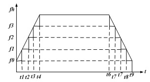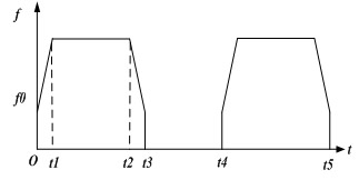 ![]() 图1 圆弧轨迹示意图 圆弧半径: 终点坐标: 终点坐标相对X轴的角度: 本系统要求输入的角度精确到1度,输入坐标的分辨率是0.01,单片机C语言的浮点运算能精确到0.000001,按照上面的公式算出的终点坐标,虽存在误差,但这个误差小于1%,能够满足所要求的精确度。 3 步进电机的变频调速 虽然步进电机具有快速启停能力强、精度高、转速容易控制的特点,但是在实际运行过程中由于启动和停止控制不当,步进电机仍会出现启动时抖动和停止时过冲的现象,从面影响系统的控制精度。尤其是步进电机工作在频繁启动和停止时,这种现象就更为明显[2>。为此本文提出了一种基于单片机控制的步进电机加减速离散控制方法。加减速曲线如图2 所示,纵坐标是频率 f,单位为脉冲/秒或步/秒。横坐标时间 t,单位为秒。步进电机以 f0 启动后加速至 t1 时刻达到最高运行频率 f,然后匀速运行,至 t2 时刻开始减速,在 t5 时刻电机停转,总的步数为 N。其中电机从静止加速至最高运行频率和从最高运行频率至停止至是步进电机控制的关键,通常采用匀加速和匀减速方式。