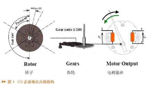 微步进电机成本低,结构简单,但具有高可靠性,且无需维护、无需反馈元件。但是经常在低速率时出现共振效应,而且随着速度增加转矩会降低。图1显示了VID步进电机的内部结构,其中左边是转子,中间是齿轮,右边是电机输出。