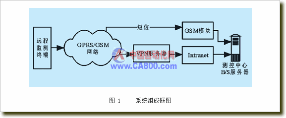 2 系统概述 2.1 系统组成 基于GPRS的油井监测系统由远程监测终端(简称RTU)、数据通讯网络和测控中心站组成,如图1所示: