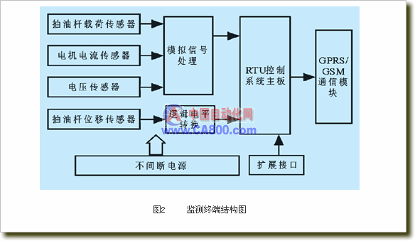 4 远程监测终端构成 如图2所示,RTU由传感器部分、信号处理部分、RTU控制系统主板、GPRS\GSM通信模块和不间断电源构成。