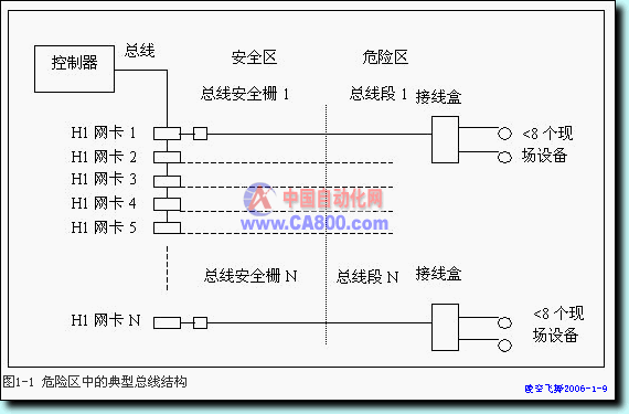 使得每个总线分支上允许连接的现场设备数量非常有限,这就又有驳于单一总线分支上尽可能多地连接设备的初衷。例如,FF每一个分支上允许连接的设备一般为 4到5个,而PROFIBUS-PA每一个分支上允许连接的设备一般为 8个左右。图1-1所示为危险区中的典型总线结构。因为总线的H1网卡必须要放置在安全区,所以这样做就要有大量的总线电缆位于安全区与危险区之间,现场总线方便接线、节省电缆的优势就大打折扣。