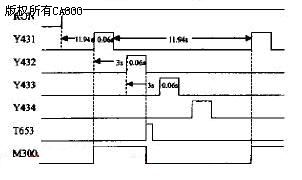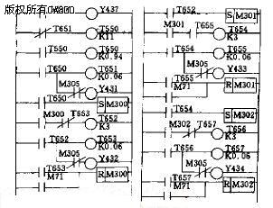 (1)主控部分 这部分实现对四台样品通电时间的顺序控制以及在必要时输出熔焊信号。主控部分梯形图如图5所示,图中T550和T650~T657实现如图4所示的有关时间段,M300~M302用来实现计时信号的保持和清除,Y431~Y434分别用来控制四台样品的通断,M305和Y437实现熔焊信号的输出。