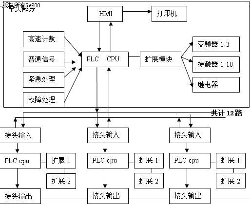 车头部分要实现的是系统的顺序启动、顺序停止、数据统计与分析、提供友善的用户界面。Plc控制三个变频器运行,并且保证系统传动的准确度达到一定标准。另外控制10个接触器,包括两个星三角转换。Plc实现同车身的数据交换.
