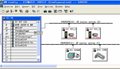 系统中将 CPU315T-2DP的两个通讯口都配置成12M bits/sec的通讯速率,其中标准的MPI/DP口用于连接人机界面和变频器,另一个Profibus DP(DRIVE)口连接伺服控制器和外接编码器。整个系统的六根轴由SIMATIC T-CPU通过PROFIBUS总线形式,采用ISOCHRONE MODE(等时同步)模式链接控制,极大地提高了系统的控制精度。硬件配置见图四。