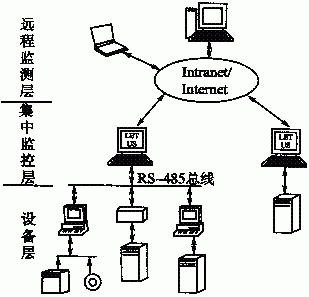 “3层功能”是指根据功能划分为设备层、集中监控层和远程监测层(集中监控层对于下位是现场设备的可实现控制,对于下位是已有监控系统只监测不控制,远程监测层只监测不控制)。设备层与集中监控层之间采用RS-485总线连接,集中监控层与远程监测层之间采用Intranet/Internet连接。