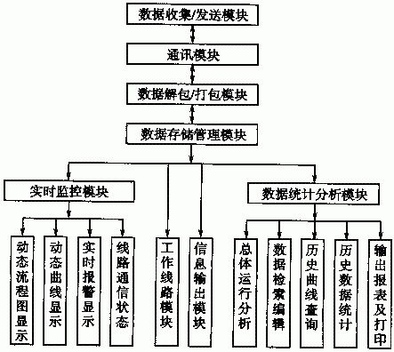 集中监控主机向各子站数据采集控制器和子系统主机发送查询数据指令,并由数据打包模块将指令整理成数据查询报文,通过通讯模块传给数据发送模块与下位设备通讯;有查询报文返回时,再通过通讯模块、数据解包模块将数据还原,然后通过管理模块对数据进行处理和存储,其中内存中的实时数据传给实时监控模块,硬盘中的数据供数据统计分析模块访问。