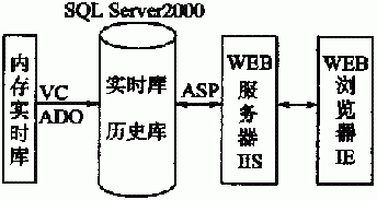 集中监控软件将实时采集的现场数据在内存中进行处理后,通过VC的ADO数据库访问技术保存到SQL Server2000中的实时数据库(临时数据库Tempdb)和历史数据库(硬盘数据库)中。远程计算机通过WEB浏览器向WEB服务器发出请求,WEB服务器处理后调用相应的ASP文件到数据库上进行查询,查询结果送回WEB服务器后,以HTML页面的形式返回到浏览器。