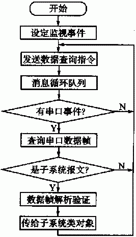 中央监控软件采用基于多线程的串行通信技术来实现对下位的查询和对数据的接收。上位软件采用多线程的“轮询”+“消息驱动”方式,在主线程中完成打开串口、配置串口、初始化串口并创建辅助通信线程,由辅助通信线程轮流向下位不同设备系统发送查询数据指令,并实时监视串口通信状态,等待下位的回复,一旦查询到数据已经发送到串行口上,辅助线程自动接收数据,并向主线程发送数据接收到的消息,主线程取走数据并进行处理。若上位通讯线程在设定时间内一直未收到下位某子系统对查询指令的回复,则发送查询下一子系统数据的指令,这样通过轮询的方式,所有子系统的数据都被传送到上位。根据现场实际,系统设有相应数量的通信线程,监视对应通信线路的串口状态,同时系统定义了发送、发送完成、接收、接收完成4个消息,以完成原定的消息处理功能。另外,考虑到与同构系统相比,异构系统存在多子系统并存且通信线路较长的特点,所以数据在传输上难免受到外界环境的干扰,为了克服因客观原因带来的通信不稳定,在程序设计上采用重要数据多次发送的方法。图4为RS-485总线通讯方式中上位软件通信线程流程。