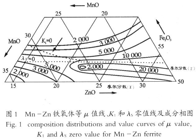 1 高性能功率铁氧体的主配方选择 为提高功率转换效率并避免饱和,要求用在高频开关电源变压器中的功率铁氧体材料具有高Bs、高起始磁导率(μi)和高振幅磁导率(μa),同时为了避免变压器在高频下发热击穿,材料的功率损耗(Rc)应尽量小,希望呈负的温度系数。可以说,衡量功率铁氧体材料优劣的3个重要磁性能参数是μi、曰Bs和Rc以及这些参数的频率、温度和时间稳定性,它们之间是一个矛盾的统一体,某些参数甚至严重对立,将它们有机统一的总体思路是控制磁晶各向异性常数K1~t曲线及铁氧体的微观结构,在配方、添加物和烧结工艺上使K1有一个好的温度特性,将K1的最小值调节到合适的位置,并使其趋向于零。
