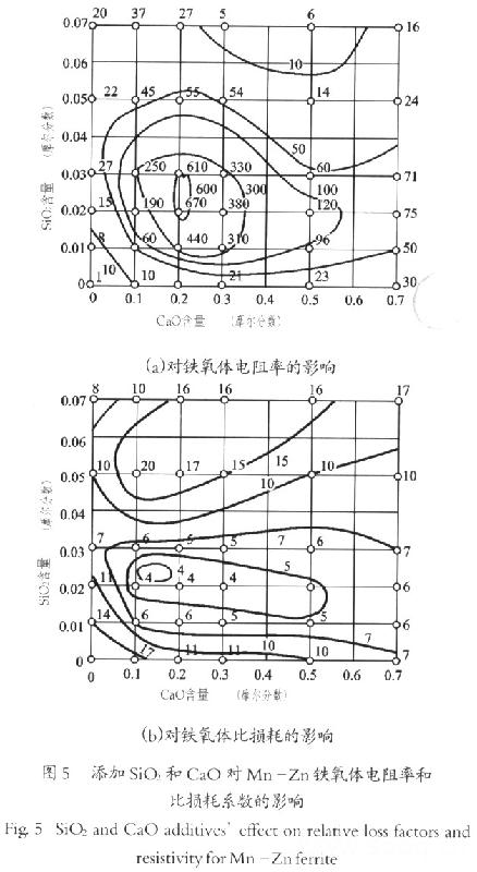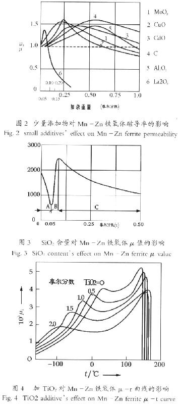 图2所示为MoO,、CuO等6种添加物对 Mn—zn铁氧体磁导率的影响,其中μ1和分别表示未掺添加物和掺入了少量添加物的铁氧体的磁导率;图3示出了掺入SiO2对Mn—Zn铁氧体磁导率的影响;图4所示为TiO2添加量对Mn—Zn铁氧体μi一t曲线的影响;图5(a)与图5(b)分别示出的是复合添加SiO2、CaO一对Mn—zn铁氧体在100 kHz时的电阻率和比损耗系数(tanδ6/μi)的影响。