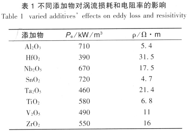 日本东北金属公司科研人员在开发SB—lM(相当于PC50)材料时,发现通用的复合添加物SiO2CaO有一部分会在晶粒内溶解,从而增大磁滞损耗,在500 kHz~1MHz条件下,其降低功率损耗的效果并不好..为此,他们开展了卓有成效的研究工作,期望找出不使磁滞损耗增大的更有效提高电阻率的添加物。表l列出了他们的研究成果,在这8种添加物中,Al2O3、SnO2、TiO2都溶解于晶粒内,几乎看不到有提高电阻率的效果,其它添加物主要在晶界内游离。这些添加物中,HfO2对提高电阻率最为显著[2>,其降低涡流损耗效果最佳。
