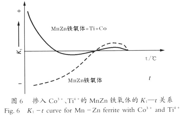 3)V2O5、Nb205、_Ti02、Ta2O5、HfO2、CO2O3等高价离子组合添加,组分不宜过多,最好不超过4种,每种添加物的重量一般应控制在1000ppm,以下; 4)在上述各添加物中,除了Co3+子外,其它离子的K1值都是负值,如飞利浦公司开发的3F3材料(介于PC40和PC50之间的一种材料),基本技术要点就是同时添加了Ti4+和C03+以控制材料的温度特性,减少磁滞损耗,如图6所示。