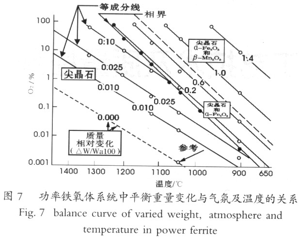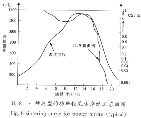 在降温阶段会引起铁氧体的氧化或还原,通过加入适量的N2保护气氛以控制窑炉内的氧分压,是为了防止铁氧体在冷却过程中Mn、Fe、CoCu等离子变价、产生脱溶物、引起晶格变化等。过度的氧化与还原,就有另相如a-Fez03、Fe0、Fe3O4、Mn203析出,从而导致磁性能的急剧恶化。图7是配方为Fe2O3:MnO:ZnO=51.9:26.8:18. 3(mol%)的功率铁氧体平衡气氛相图,从图7中可看出气氛对尖晶石相和Fe2O3相界内氧化状态的重要性。要特别注意,先沿等成分线冷却,接着在最低的温度下通过相界迅速冷却,这时生长动力学不敏感,使a-Fe203的脱溶最少,氧化和生成另相的程度最轻。图8列出了功率铁氧体的典型烧结工艺曲线。