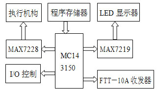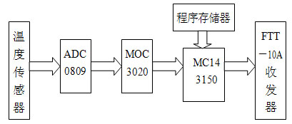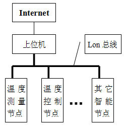 图1 系统结构图 ![]() 图2 温度控制节点结构图 3.系统结构设计 系统结构如图1所示,共包含三大部分:上位机、LON总线和智能节点。其中: 上位机主要负责LON网络的安装、维护和管理,可对温度进行实时监控。同时建立测量值数据库,对数据进行存档和归表以便查询、打印。上位机还可作为Web服务器与Internet相连,实现远程监控。 智能节点主要包括温度控制节点和温度测量节点。温度测量节点对温度进行测量并对非线性值进行线性化处理,使得到的数值有足够的精度和线性度,并定期将温度对应的数字量发送到LON总线上交上位机处理。温度控制节点采用模糊控制算法对冷水阀进行控制,并负责各采样点温度采样值的显示与上传。 4.智能节点硬件设计 智能节点采用的Neuron芯片是可带外存储器的MC143150。其片内有三个CPU,即:网络CPU,应用CPU和介质访问CPU。它们与I/0口驱动电路、定时器、片内存储器、网络通讯接口通过8位数据总线和16位地址相连。该芯片有11个可编程的I/0口对象。通过引脚的不同配置,为外部硬件提供灵活的接口,实现不同的I/0对象。 4.1温度控制节点的设计 温度控制节点主要包括:Neuron芯片MC143150,外带的程序存储器,D/A转换,执行机构,显示电路和总线收发器等,如图2所示。D/A转换选用MAX7228,显示电路由MAX7219及相关的驱动电路构成,执行机构包括AD694及其相关的外围电路。执行机构是角行程电动执行机构,应用于冷水阀控制。模糊推理所用的知识库数据存放于神经元芯片的E2PROM存储器中,有一组初始值。系统运行期间可以通过LON总线从上位机获取新的控制参数,从而完成控制参数的更新。 4.2温度测量节点的设计 温度测量节点的结构如图3所示。包括神经元芯片MC143150,程序存储器,温度传感器,光电耦合器MOC3020,A/D转换电路ADC0809, FTT-10A收发器等。