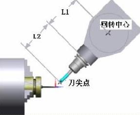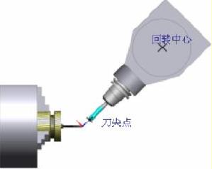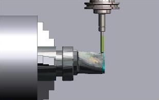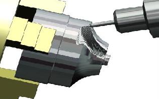 图三 对于具有B轴功能的高端车铣设备来说,通过B轴摆角定位加工或是XYZBC五联动加工,还可以获得更好的加工表面质量(图二)。同时这类设备还可以完成更复杂的叶轮叶片的加工(图三)。 由于旋转角度坐标的存在,在CAM软件中进行编程操作时,人们习惯上使用刀尖点的绝对坐标编程模式,生成的NC代码在机床上运行时,需要控制系统具有三维刀具长度补偿的功能(如图四所示),根据实际使用的刀具长度L2,控制系统在三维空间上自动实现刀具长度补偿。(注:实际上控制系统在补偿计算时,计算的依据是L1+L2的值,而L1的值可以在机床调试完成后直接在机床系统参数中设定)。如果控制系统没有三维刀具长度补偿功能,则需要事先在对刀仪上测量出刀具的长度,然后在CAM软件环境下指定刀具长度参数后再生成加工程序,实际上生成的NC代码中的坐标点是回转中心的坐标,此类程序在应用过程中,必须使用指定长度的刀具。(在上世纪末期,控制系统还不具备三维刀具长度补偿功能时,都是使用此种方法来完成五轴坐标程序的编制,为方便刀具的使用,机床主轴上通常增加一个可伸缩的套筒部件,来调整刀具长度为编程时设定的刀具长度)。