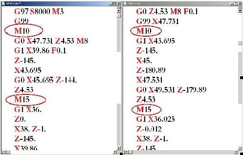 可以通过上下刀架的同步设置,一次完成两段外形的加工 双刀塔的设备都具有双通道的控制系统,上下刀架可单独控制,同步加工可以通过代码中的同步语句来实现。例如,在下面的代码中,M10和 M15就是同步语句,同步语句的语法要求根据控制机的要求制定,同步语句的数量根据同步加工内容决定。同步语句之间的内容即为同步加工的内容。