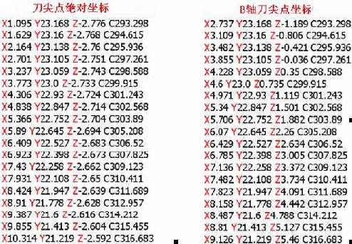 这里可以看到,两种模式下,程序中的旋转坐标相同,但是直线坐标有所不同,也就是刀尖点的位置相对于当前坐标系的值发生变化。B轴坐标跟随功能一般情况下通过一对G 代码指令实现开关。