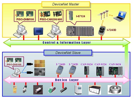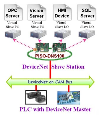 DeviceNet 是一个简单的而且开放式的网络解决方案,能有效地降低配线的成本及节省安装设备的时间。泓格公司于目前推出一款DeviceNet Multi-Slave PCI 板卡PISO-DNS100,为使用者提供PC-based的DeviceNet Slave解决方案,让PC变成一部虚拟的DeviceNet Slave工作站。远程的DeviceNet Master可以透过DeviceNet网络与PC交换数据。PISO-DNS100板卡内含186 80M Hz的CPU,可独立运作DeviceNet Slave韧体,并采用DPRAM与PCI bus沟通。不但能大大地降低控制系统的负担更能提供有效率的控制方式,并提供多功能的工具与windows函式库,帮助客户快速建立虚拟DeviceNet Slave 工作站。泓格公司同时也提供多样化的DeviceNet Master PCI 板卡。可参考下列网页 :