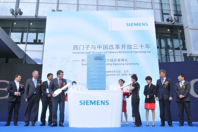 西门子中国新的总部大楼——西门子中心(北京)——落成典礼于9月23日在北京隆重举行。这一新的总部大楼的落成是西门子在中国136年成功发展进程中又一座新的里程碑,同时也使之跻身北京顶级绿色楼宇行列。北京市副市长程红、朝阳区委书记陈刚、西门子股份公司管理委员会成员、亚太业务总裁荣怀德教授和西门子东北亚业务大区首席执行官、西门子(中国)有限公司总裁兼首席执行官郝睿强博士出席了落成典礼,并为这座位于北京东北部望京地区高达123米的摩天大厦剪彩。来自国家发改委、北京市商务局、北京市投资促进局、北京市建委、北京市交委等政府部门的官员、西门子业务伙伴和客户以及员工代表200余人参加了庆典并参观了新总部大楼。