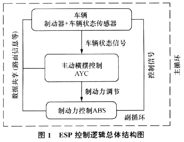 ESP从控制功能来看,包含了防抱死制动系统(ABS)、驱动力控制系统(TCS),以及主动横摆力偶矩控制系统(AYC)。控制逻辑总体结构如图1所示。