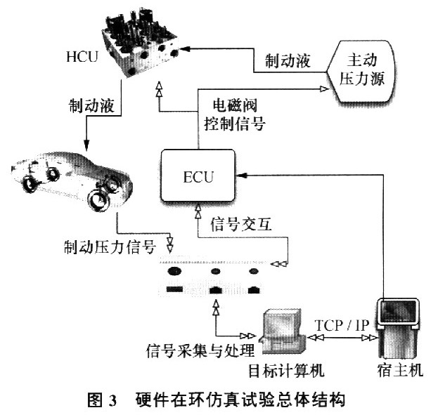 宿主机内利用Simulink建立了15自由度的整车模型,利用xPC工具通过TCP/IP将模型下载入目标机实时运行。实时运行的模型采集制动压力信号,计算出当前的车速、横摆角速度、前轮轮速,连同模型中设定的方向盘转角一并传递给ECU。ECU根据当前状态判断车辆的稳定情况,一旦检测到失稳倾向,就立刻控制HCU电磁阀及主动压力源电磁阀进行增减压操作。新的压力信号又反馈给目标机,目标机根据新的制动压力信号计算下一个步长的车辆状态,形成一个闭环。