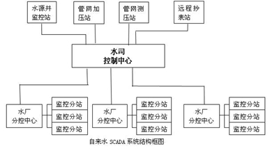城市自来水SCADA系统可划分为5个组成部分:水司控制中心、水厂分控中心、管网测压站、管网加压站和水源井监控站。其结构框图如图所示。