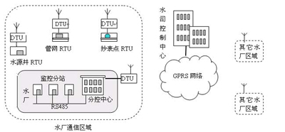 城市自来水公司生产过程自动化监控系统(SCADA)包括:水司控制中心、多个水厂分控中心、多个水厂监控分站、多个水源井监控站、多个管网加压站和多个管网测压站。除一个水厂内各监控分站较为集中外,其它监控站点均散布在城市的各个区域。由于GPRS网络覆盖面广,通讯速率高,稳定性好,H7000 GPRS无线数据传输系统有着显著的优势: