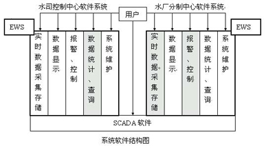 自来水SCADA系统软件分为两大部分:水司控制中心软件系统软件和水厂分控中心系统软件。它们结构类似,只是侧重点不同。前者侧重于统计、查询,后者侧重于报警和控制。它们的结构如图所示。