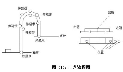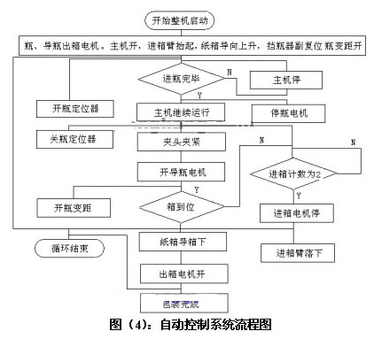 四连杆装箱包装机是一种一次可以装四箱(可以是纸箱)既4×4瓶或者三箱 3×4瓶的连续装箱的包装机械设备。在啤酒等瓶装饮料行业中,四连杆装箱包装机主要完成瓶装产品的装箱、卸箱等工作。由于具有性能优良等特点,在包装行业中使用非常普及。 对于四连杆装箱包装机中电气部分的控制,是包装机使用安全、可靠性的重要保证。目前,老型号的四连杆包装机的电气装置大多采用继电器的控制方式。这种控制方式连线复杂、继电器使用数量多,造成电气控制部分可靠性差、故障率高,日常维护量大。同时,设备缺少操作的安全保障措施,容易发生事故。 随着可编程控制器(PLC)技术的发展,把PLC控制技术应用于四连杆包装机的控制中,取代原有的控制线路。是四连杆装箱包装机控制系统发展的必然趋势。 二、系统结构 四连杆装箱包装机控制系统由电气部分和气动执行部分组成。工作过程见流程图(图1)。