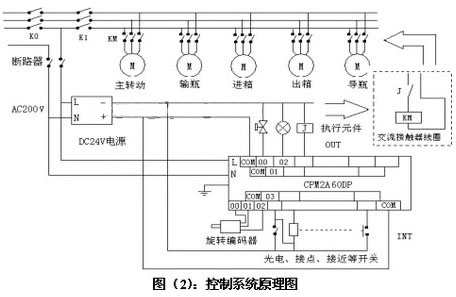![]() 电气系统输出控制在电气控制部分的改造中,分析了包装机的工作过程和控制特点;对包装机的控制基本上都是光电开关、接近开关、电磁阀、电机等这类的开关量输入、输出设备。控制过程以连续的逻辑量控制为主的操作方式。PLC的开关逻辑和顺序控制是PLC应用最广泛、最基本的功能,基于PLC的这一使用功能和特点,决定将原有继电器控制系统全部拆除,采用PLC控制。因为该用户厂家其他自动化设备使用的基本都是日本Omron公司的PLC,再根据采集和控制点数,我们选用Omron公司的SYSMAC CPM2A-60CDR-A的 PLC作为系统控制器。 三、系统设计 1.四连杆装箱包装机的电机可以进行点动、正转和反转,以带动夹瓶装置做往复运动装箱。瓶电机和两个箱电机分别用作传输瓶和传输箱。七个电磁阀和与之对应的气缸,分别控制“夹头”,“定位器”,“出箱臂”及“进箱臂”“箱导向”。设“手动”和“自动”操作两个切换开关。 2.在包装机的操作前台和设备后台、侧面加装3只光电检测开关,在操作人员误入设备危险区域时,系统紧急停车,保证安全。 3.在传送带上安装Omron的E6A2旋转编码器,测量传送带的速度。当传送带电机异常停车时,停止包装机工作。 4.系统输入回路中有光电开光和接近等开关,PLC上的DC24V电源容量就不足了,各输入、输出元件均使用DC24V直流稳压电源。PLC控制系统原理图见图(2)。