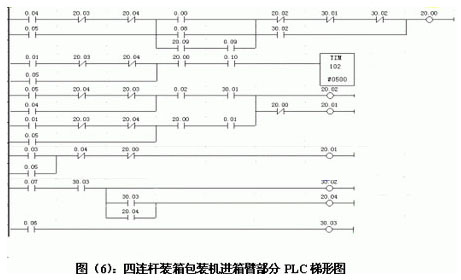 ![]() 其中,PLC主程序参照原有继电器控制系统的电气控制原理图进行设计,这种程序设计方法简单,有现成的电气控制线路为依据,设计周期短,在旧设备电气系统改造中经常采用。 按照原有电气控制系统输入信号及输出信号做为PLC的I/O点,原来由继电器硬件完成的逻辑控制功能由PLC软件——梯形图替代完成。图(5)为四连杆装箱包装机进箱臂部分电气控制原理图。图(6)为转换后的四连杆装箱包装机进箱臂部分PLC程序梯形图。进箱臂部分主要I/O对照表如下: