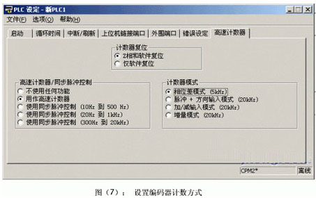 ![]() 五、系统调试 1.调整光电开关SQ1和反射板的安装距离,使光电开关处于工作状态时,调整到“挡光”,PLC输入通道HR0003的指示灯亮。以同样方法调整好光电开关SQ2、SQ3、SQ4……10。 2.调整接近开关JQ0,使“夹头”在运动轨迹的最低点时接近“档块”,并使PLC输入通道HR0012指示灯亮,以同样方法调整好接近开关JQ2、JQ3、JQ4、JQ5。 3.调试旋转编码器时,A、B、Z相按说明书接线,在PLC编程软件中对编码器的高速计数进行设置,使用Z相加软件复位方法。见图(7)。按下按钮5SA,使传送带电机停车时,四连杆装箱包装机应停止工作。