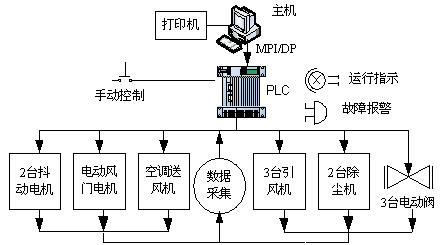 该药厂的空调系统由两台抖动电机、一个电动风门、一台送风机、三台引风机、两台除尘风机、一个蒸汽电动阀和两个冷液电动阀组成。要求系统运行时首先打开两个电动阀,然后按一定的顺序运行各个送风机,关闭时先关闭电动阀,然后按一定顺序关闭各个风机,达到除尘、送风、降温或升温的目的,保证清洁区达到指标要求。同时,系统要具有定时自动、手动运行功能,并要求在系统出故障时可以报警并诊断故障类别。