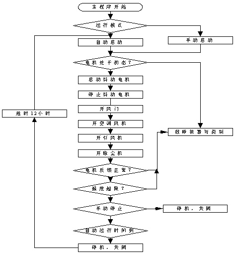3 系统软件设计 系统的程序设计是在STEP7 V5.2软件平台下进行的。STEP7 V5.2可支持梯形图、SIMATIC指令和功能图。且具有指令丰富、结构清晰、编程方便的优点。在程序设计中,将整个系统分为:“手自动切换及互锁”、“自动运行定时”、“顺序开关风机及电动阀”、“故障报警与诊断”等模块。 系统进入运行状态后,首先根据转向开关确定是进入自动状态还是手动状态。在手动状态下,可以在控制面板上进行手动操作。在自动状态下,系统将自动按流程工作。在系统运行时,首先检测各执行器是否正常(接触器触点是否粘合)以及电动阀的状态。如果发现异常,则报警并给出故障类别(故障位置),然后系统处于等待状态,等待故障排除,重新运行;如果正常就进入运行状态。首先两台抖动电机运行30秒后停机,同时打开电动风门,3秒后启动空调送风机,然后顺序启动三台引风机,最后是两台除尘风机。系统进入正常运行过程中,故障诊断程序不断扫描各个反馈信号,当任一风机过载不能正常运行或加热器、冷凝器工作异常超温时,空调机组自动停机,故障部位报警指示。无故障时,等待自动关机或手动关机。总之,在每个PLC循环周期只运行一个状态的指令,这样可以节省CPU的资源,提高系统的实时性。系统控制程序的流程图如图3所示。