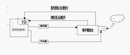 通过蒸汽管道上的压力变送器将所需蒸汽压力标准电信号送入鼓风变频器PID 控制器的反馈通道, 经处理后与设定蒸汽压力值比较, 经过PID 控制器产生运算信号, 此信号控制鼓风变频器调节电机转速, 使蒸汽管道上压力基本稳定在设定值, 从而达到自动跟踪蒸汽管道上压力。