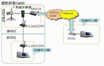 解决方案 如图所示,自动气象站采集的数据向两个中心端同时发送,远端中心端(气象局)采用Helicomm的GPRS数传终端MA8-9i为传输设备,通过GPRS和Internet网络采集气象数据;近端中心端(学校机房)采用Helicomm基于ZigBee技术自主研发的IP-Link2220H数传终端为传输设备,通过其自组的无线mesh网络采集气象数据。每分钟采集一次,一次1K数据,通过中心端软件可以方便快捷的即时查看风速、气温、降雨量等相关参数,合理节省了校园内部的数据采集通讯费用。