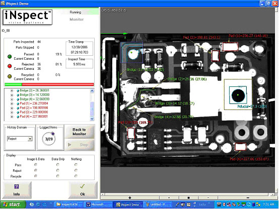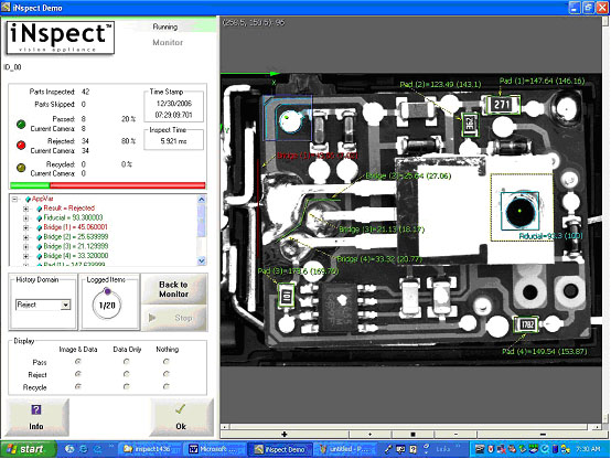 定位设置允许被检测的PCB产品有小幅度的旋转,在X、Y轴上允许存在少量偏移。对于焊接处的检测,我们设置了4个线形的ROI(regionofinterested即感兴趣的区域)来判断是否焊接正确,并对这4个线形的ROI设置了标准偏差来控制其对具体变化产生的敏感度。注意:用平均灰度值去判断焊接处并不是很好的办法,因为如果被检测的区域很小,那么平均灰度值就显得不够灵敏了。最后,用4个矩形ROI的平均灰度值来检测另外的4个安装部位的组合部件是否安装到位。在这种情况下,对于这4个矩形ROI,平均灰度值对部件的安装到位和缺失十分敏感,因此可以做出准确判断。
