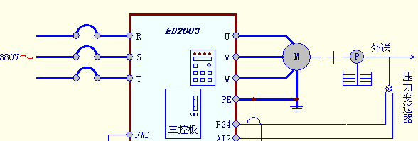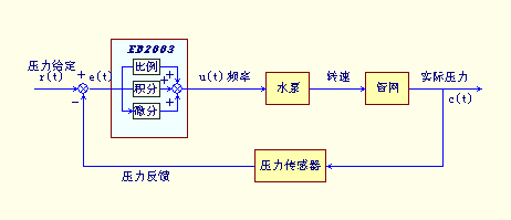 恒压供水系统的变频器接线图 一般按照工艺对控制性能的要求,来选择比例常数Kp和积分常数Ki。比例控制KP加大,使系统的动作灵敏,速度加快,KP偏大,振荡次数加多,调节时间加长。当KP太大时,系统会趋于不稳定。若KP太小,又会使系统的动作缓慢;积分环节Ki通常使系统的稳定性下降。Ki太小系统将不稳定。Ti偏小,振荡次数较多。Ki偏大,对系统性能的影响减小。当Ki合适时,过渡过程比较合理。微分控制Kd可以改善动态特性,当Kd偏大时,超调量δd较大,调节时间较长,当Kd偏小时,超调量δp也较大,调节时间也较长,只有Kd合适时,可以得到比较满意的过渡过程。 PID调节过程首先引入比例控制KP,在系统稳定的情况下,减小稳态误差,提高精度,但是加大KP只能减小稳态误差,却不能完全消除稳态误差。然后引入积分控制Ki,消除系统的稳态误差,提高控制系统的控制精度。最后引入微分控制Kd,减小超调量,改善系统品质。变频器根据偏差调节PID的参数,当运行参数远离目标参数时,调节幅度加快,随着偏差的逐步接近,跟踪的幅度逐渐减小,近似相等时,系统达到一个动态平衡,维持系统的恒压稳定状态。
